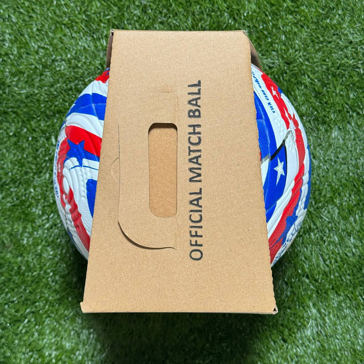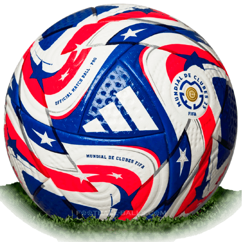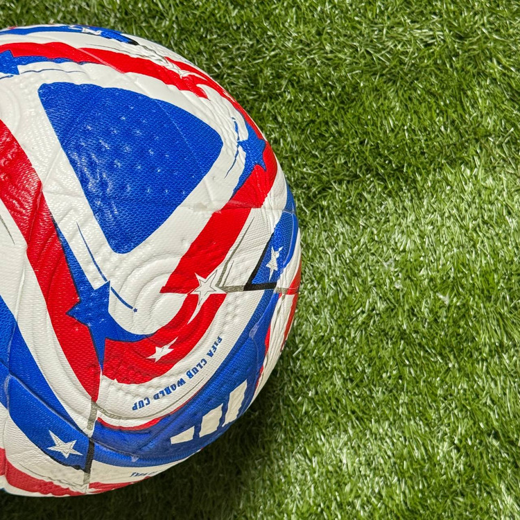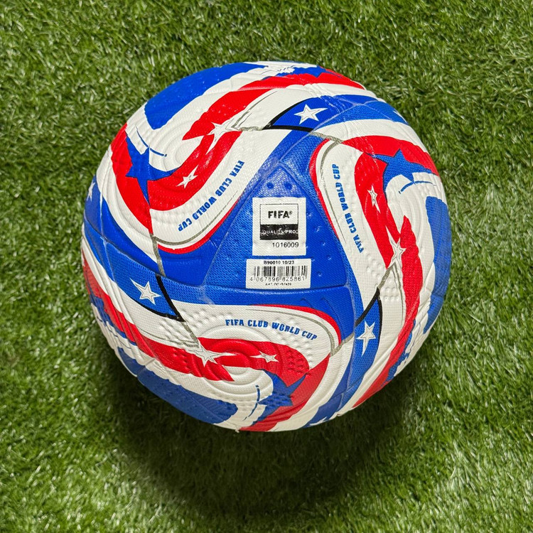 توپ Mundial de Clubes 25 با طراحی شیک سفید، پنلهای آبی، نوارهای قرمز و الگوی ستارهای، هم زیباست هم حرفهای.