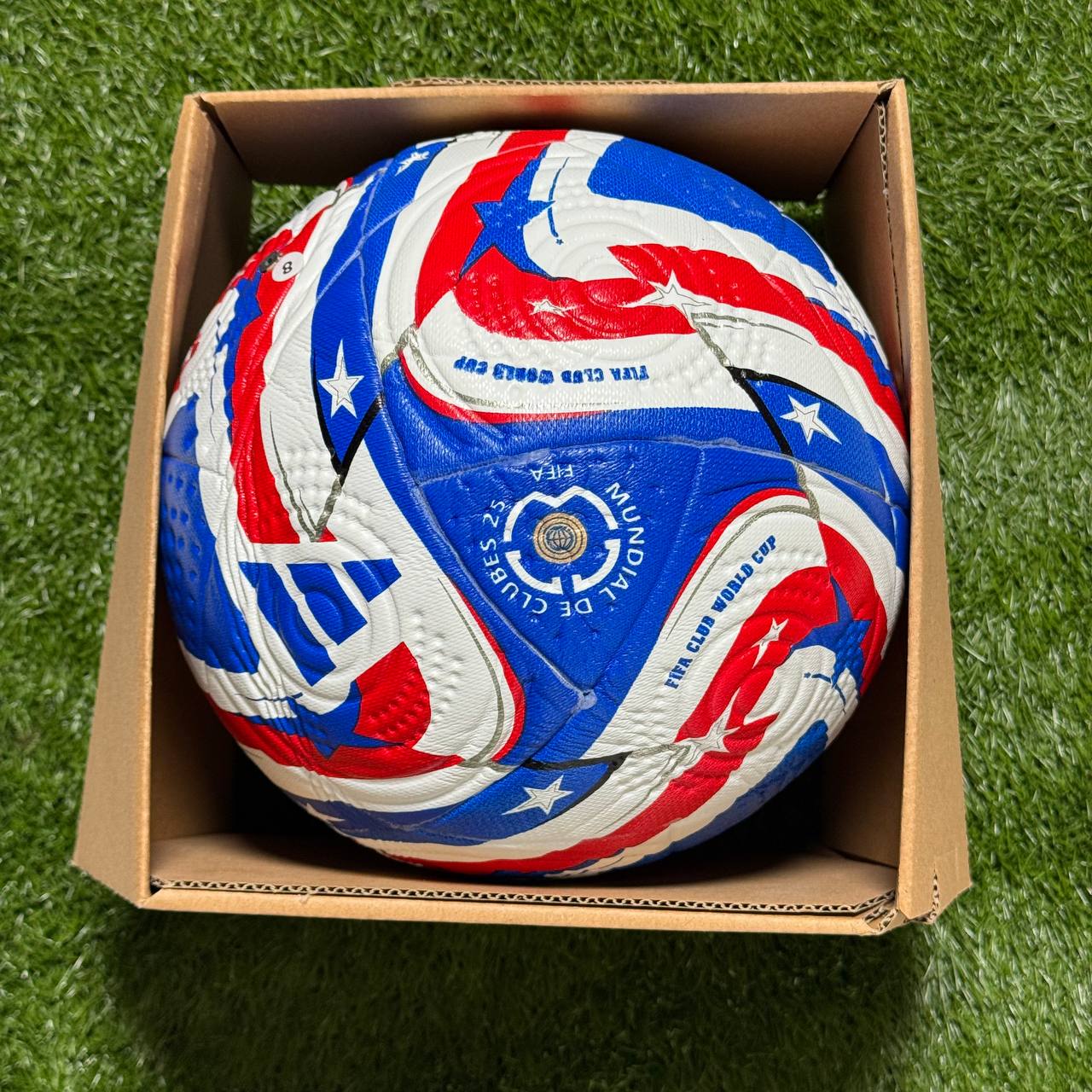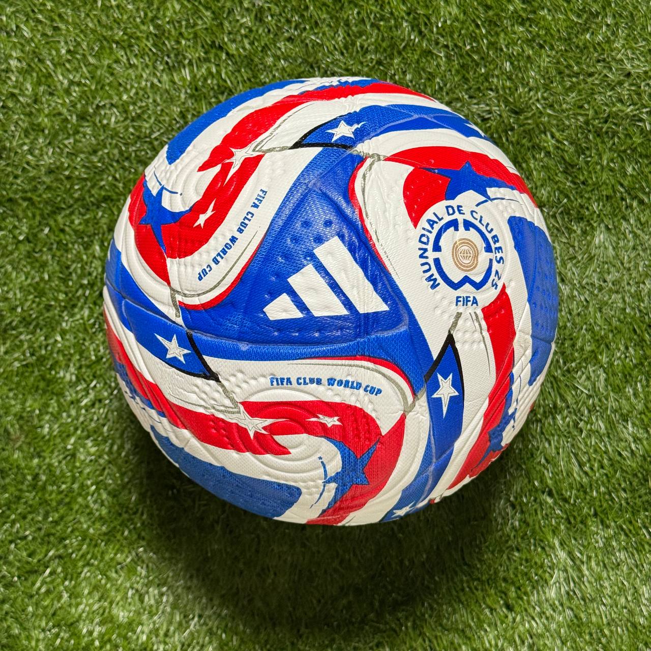توپ Mundial de Clubes 25 با طراحی شیک سفید، پنلهای آبی، نوارهای قرمز و الگوی ستارهای، هم زیباست هم حرفهای.